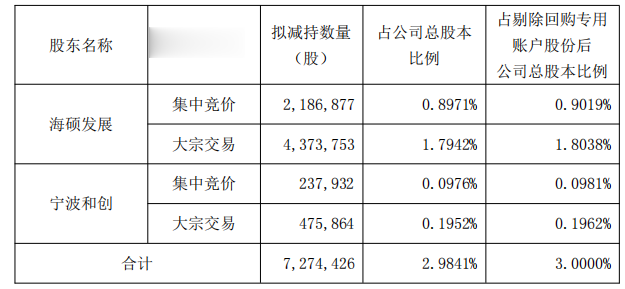 海硕发展、宁波和创计划自公告披露之日起15个交易日后的3个月内,合计减持公司股份不超过7,274,426股,占公司总股本的2.9841%,占剔除公司回购专用账户股份后总股本的3.0000%,其中,以集中竞价方式减持公司股份不超过2,424,809股,占公司总股本的0.9947%,占剔除公司回购专用账户股份后总股本的1.0000%,以大宗交易方式减持公司股份不超过4,849,617股,占公司总股本的1.9894%,占剔除公司回购专用账户股份后总股本的2.0000%。