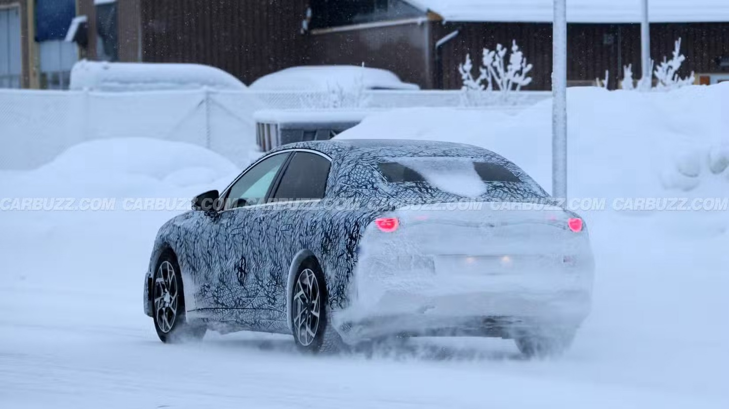 此外,车辆 C 柱区域较长,虽然营造了流畅的溜背感,但也可能导致后备箱开口变窄,并增加驾驶员的后方盲区。有趣的是,测试人员似乎在车尾积雪上随手画了一个假贯穿式灯条来迷惑路人,实际尾灯位置则位于更高处。
