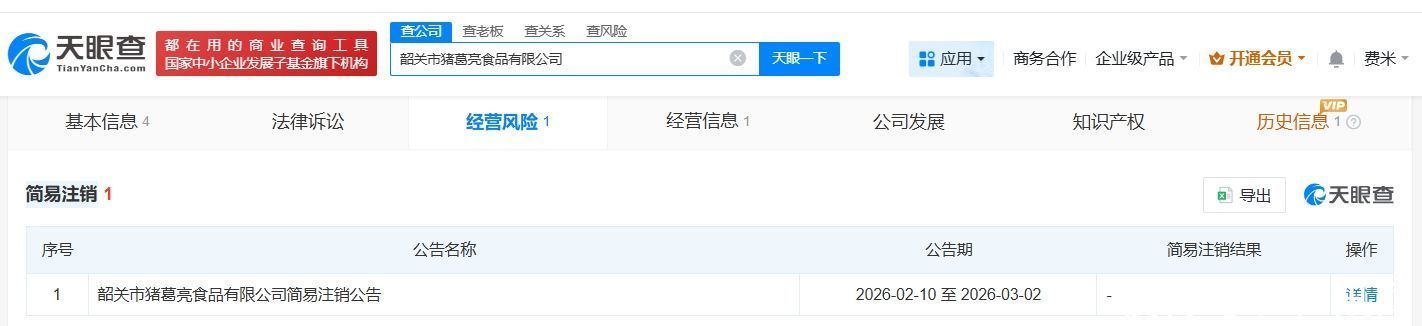 天眼查App显示,近日,韶关市猪葛亮食品有限公司登记状态由存续变更为注销。此前,该公司已发布简易注销公告。