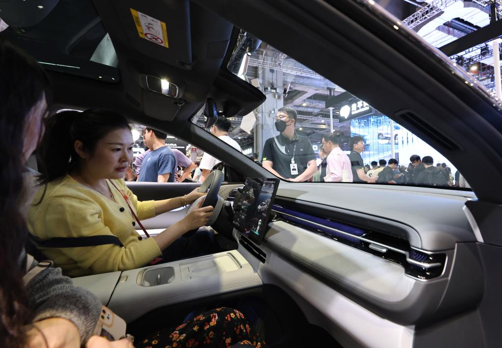2025年4月26日,第二十一届上海国际汽车工业展览会上,参观者在小鹏G6展车内体验车载智能系统。新华社记者方喆 摄